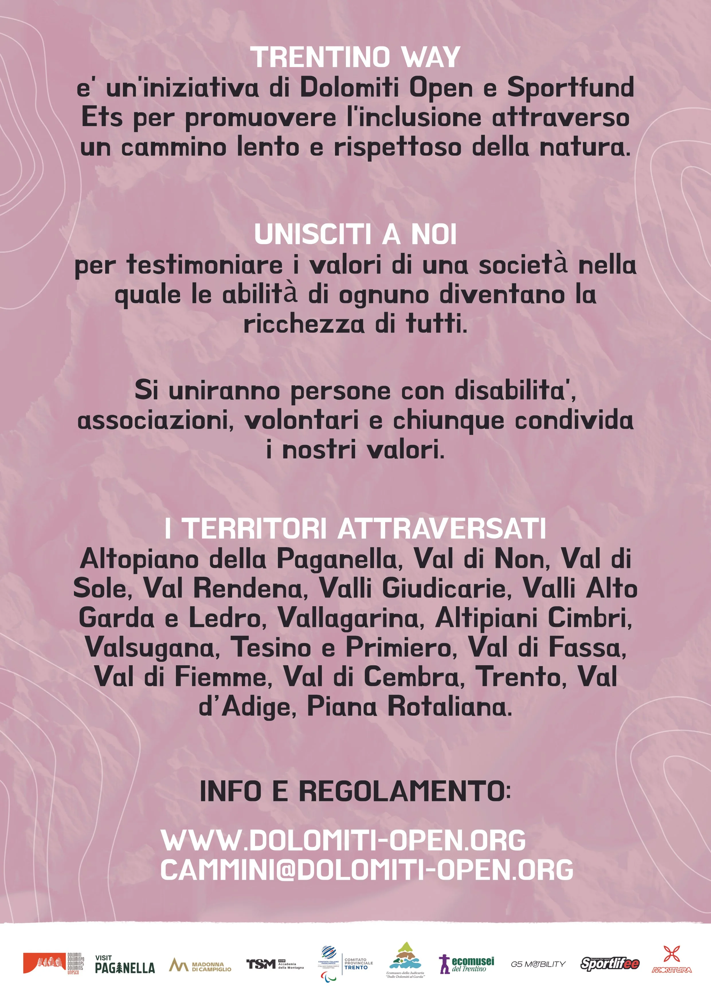 Ad oggi, oltre agli enti sostenitori e patrocinatori del progetto, si uniranno in alcuni tratti del cammino: , le Cooperative sociali Gsh, Grazie alla Vita, Incontra, Abilnova, CS4, la Fondazione Trentina per l’Autismo-Casa Sebastiano, le associazioni Anffas, Liberamente Insieme Anffas, SportAbili, le Associazioni Italiane Afasici–Regione Sardegna, Cts Onlus (Centro trentino di solidarietà); oltre a realtà come Unpli Trentino (Federazione trentina Pro Loco), la Rete Ecomusei del Trentino, gli Ecomusei della Judicaria, Argentario, sull’Acqua di Levico Terme, Vanoi, Val Meledrio, le associazioni Trekking Italia, Accompagnatori di media montagna del Trentino. Fiemme, Fassa sport inclusivo (l’elenco è in continuo aggiornamento).
